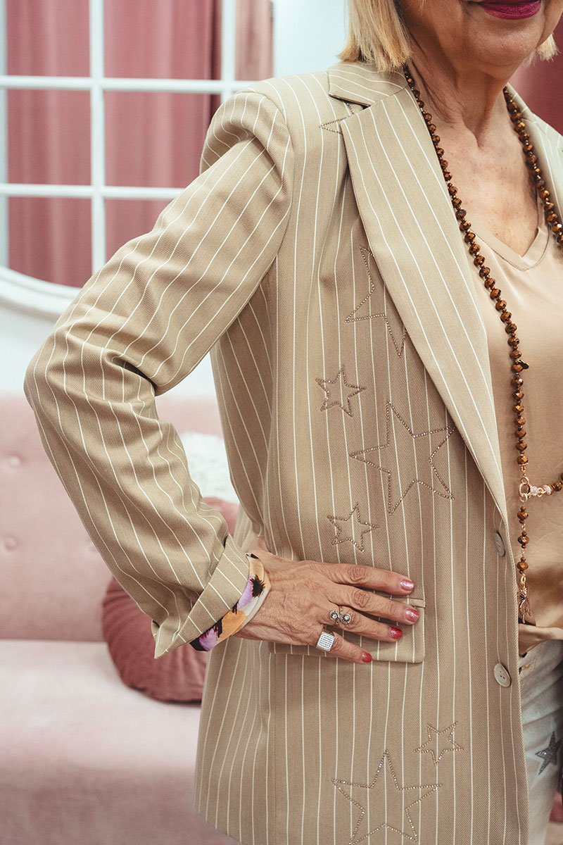 L’effetto gessato beige e bianco dona raffinatezza e leggerezza al look, mentre le stelle applicate con strass sulla parte anteriore aggiungono un tocco glamour e distintivo.