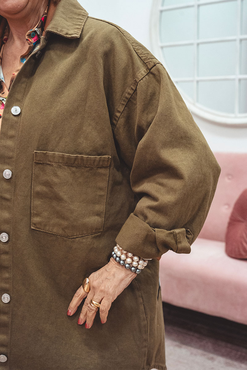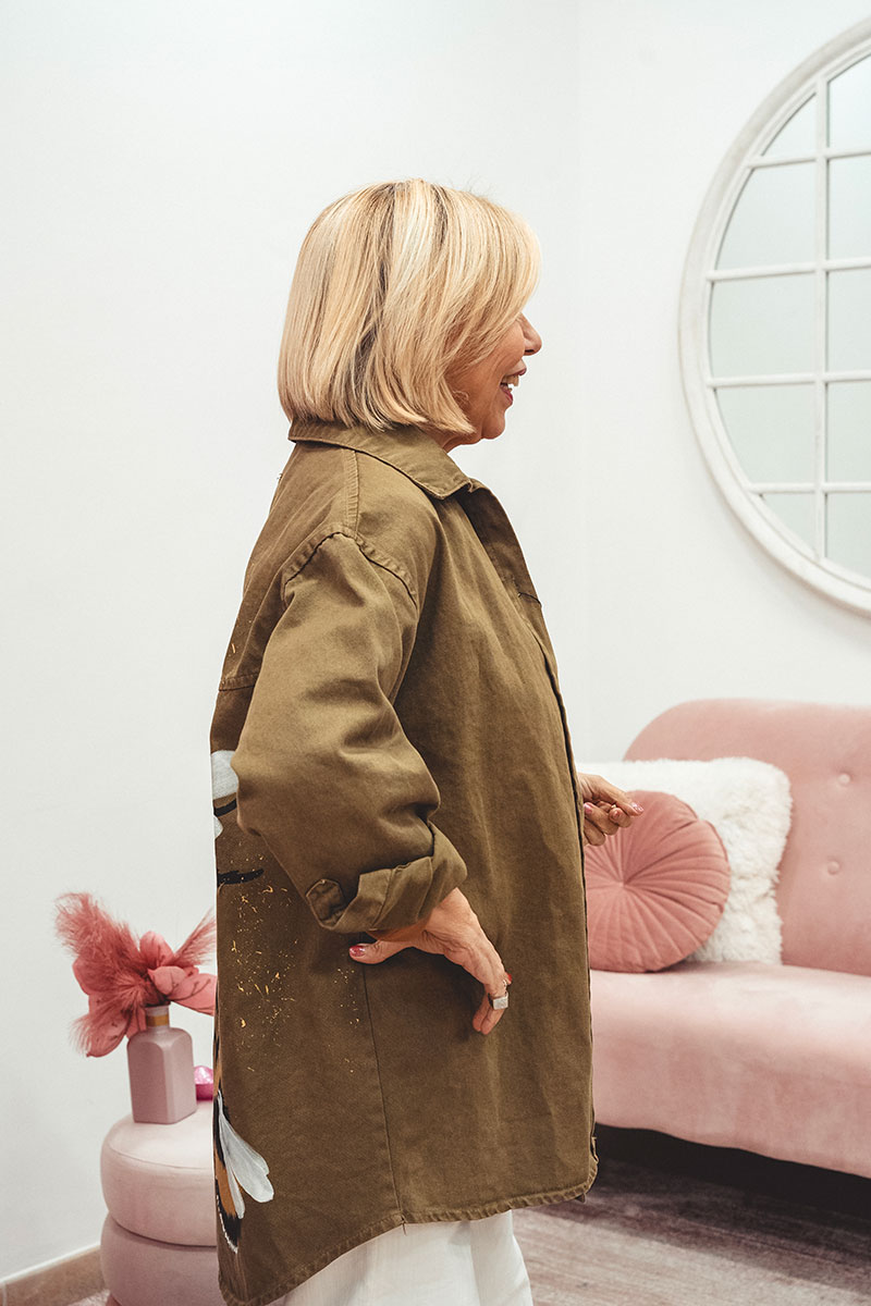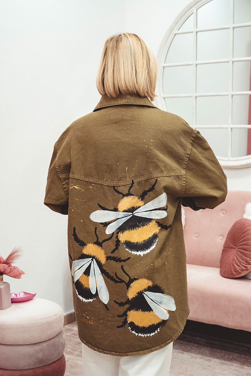 La camicia oversize verde è impreziosita da api dipinte a mano, dettagli unici che rendono ogni pezzo speciale e irripetibile.