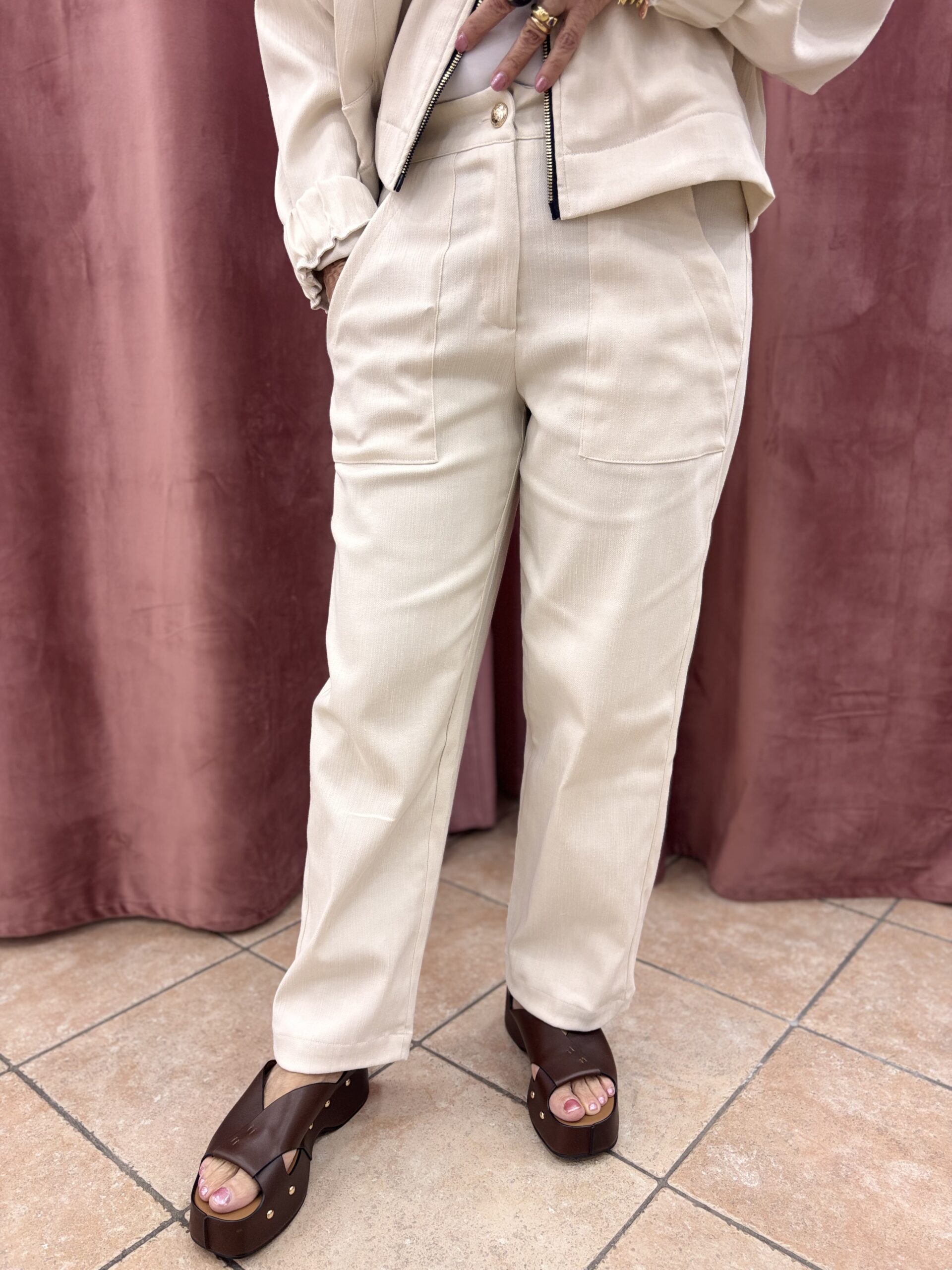 Completo Paola Tienforti composto da giubbino con zip anteriore e pantalone con tasconi laterali.