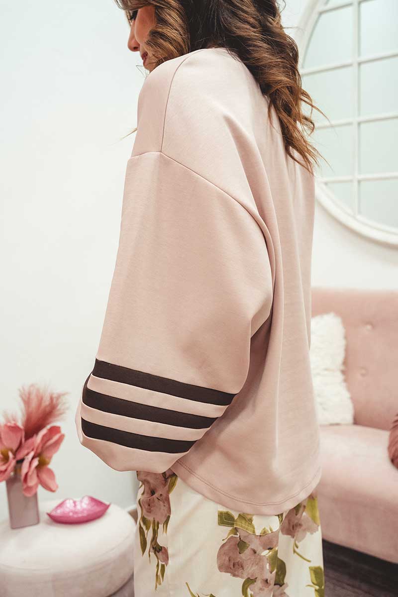 Felpa ultra leggera rosa chiaro con maniche ampie, polsini e dettagli a righe color cioccolato.