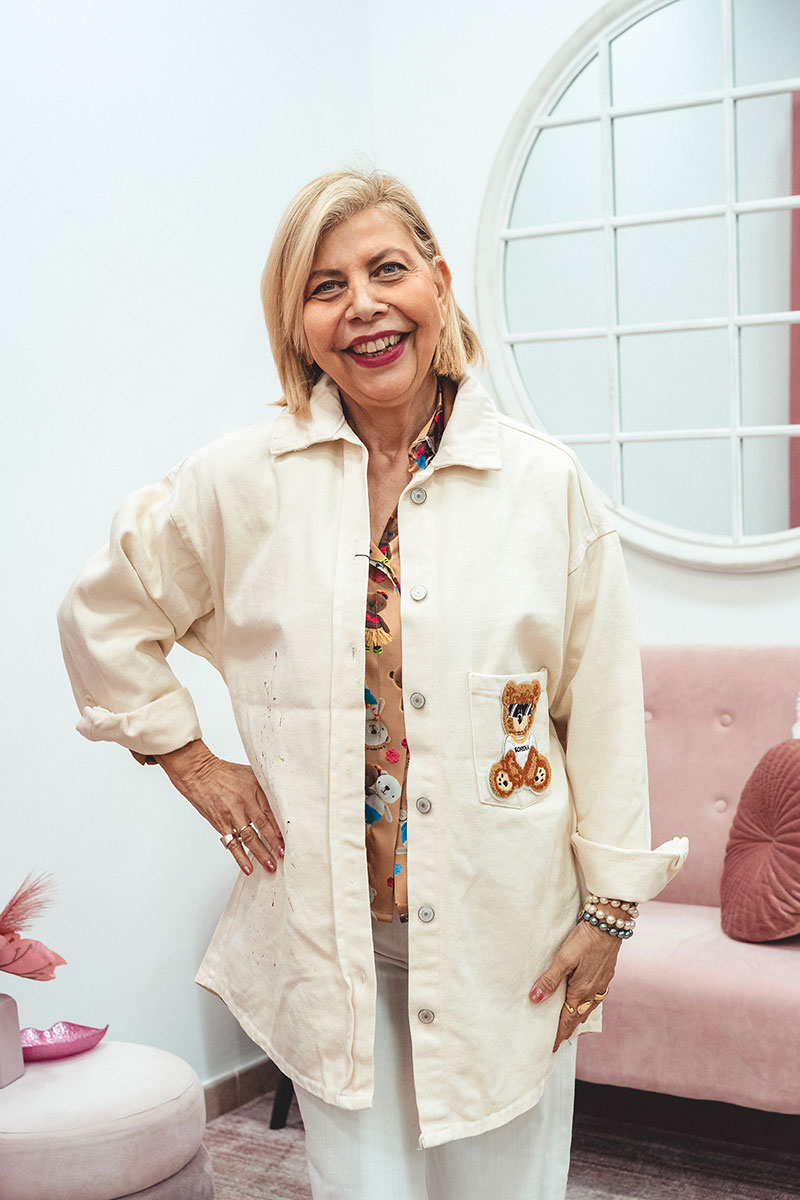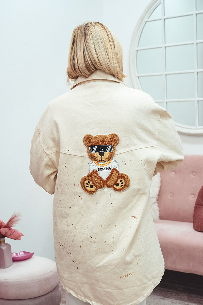 Giacca camicia oversize panna con orso e dettagli dipinti a mano