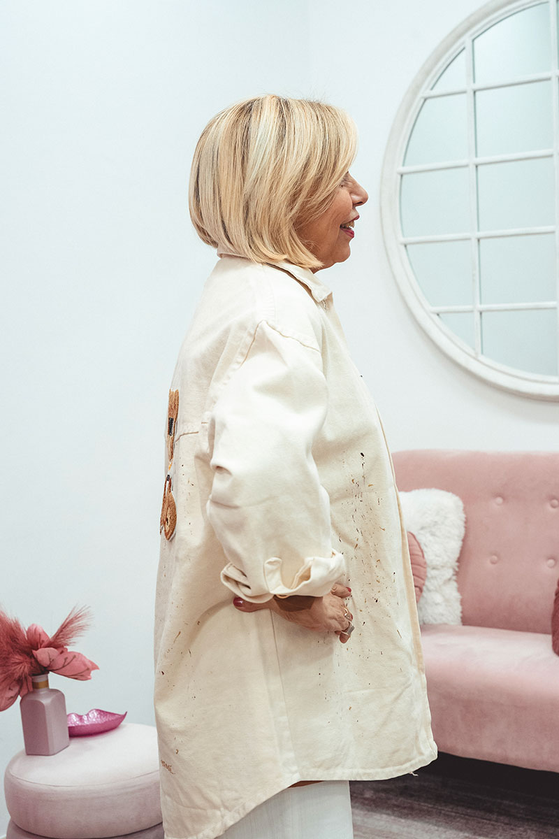 Giacca camicia oversize color panna con applicazione orso e dettagli dipinti a mano. Originale e di carattere.