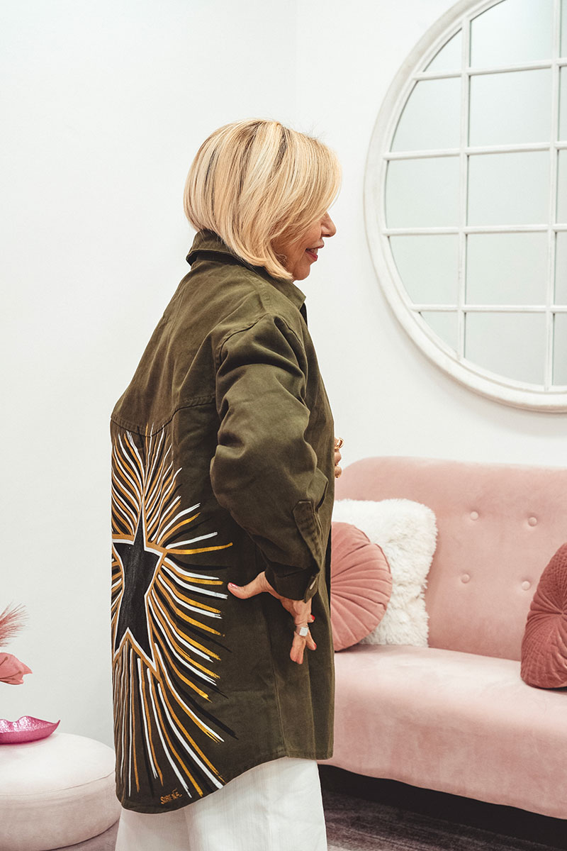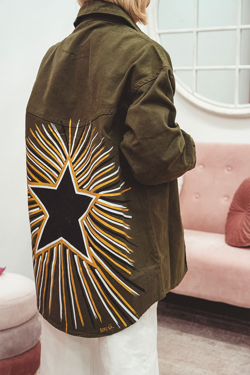 La giacca camicia oversize verde militare è impreziosita da una stella dipinta a mano, dettaglio unico che rende ogni pezzo speciale e distintivo.