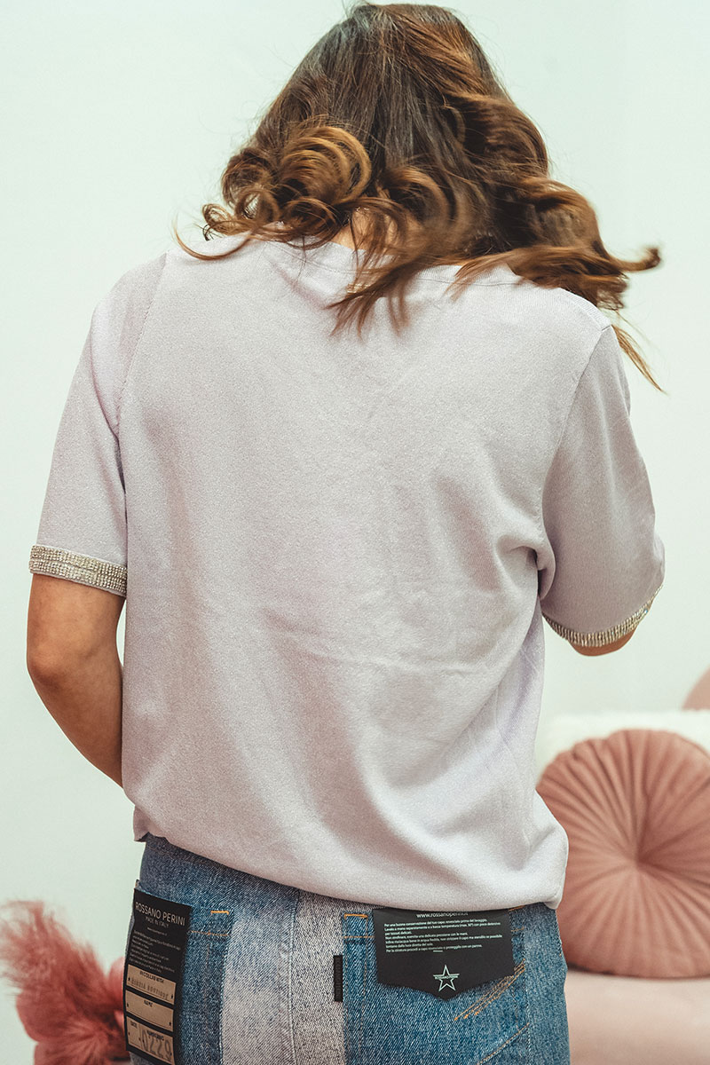Lo scollo a V valorizza il décolleté con eleganza, mentre i dettagli in argento donano luminosità e un tocco raffinato. Il colore lilla, romantico e moderno, si presta a molteplici abbinamenti, dal casual al più sofisticato.