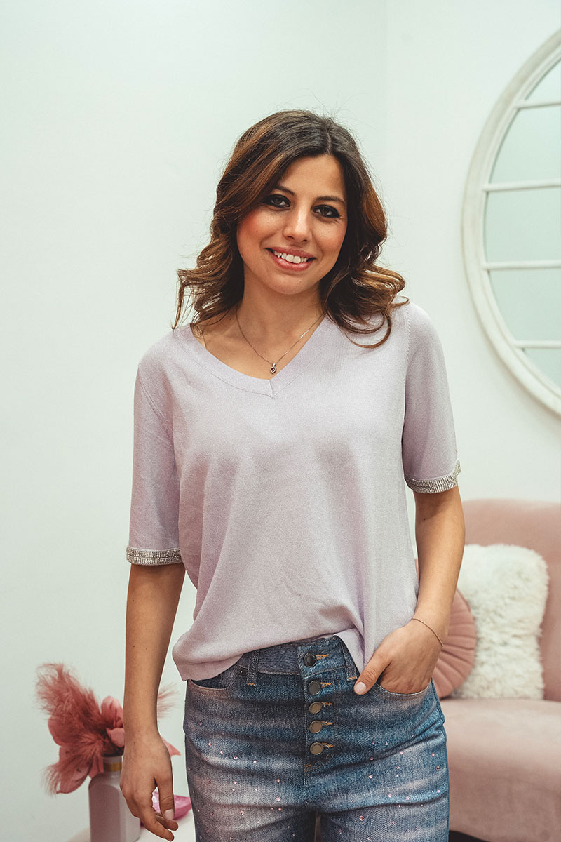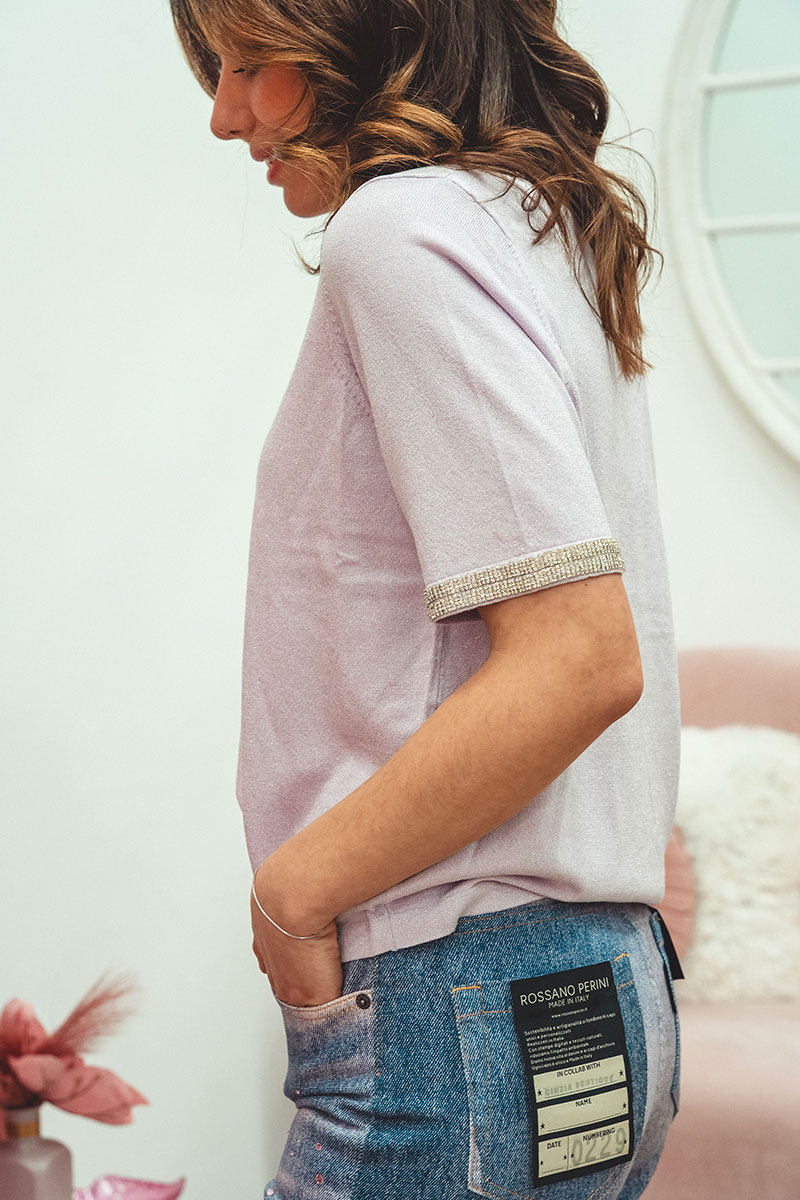 Delicata ma con carattere, la maglia lilla con scollo a V è il capo perfetto per aggiungere un tocco di colore e luce al tuo outfit.
