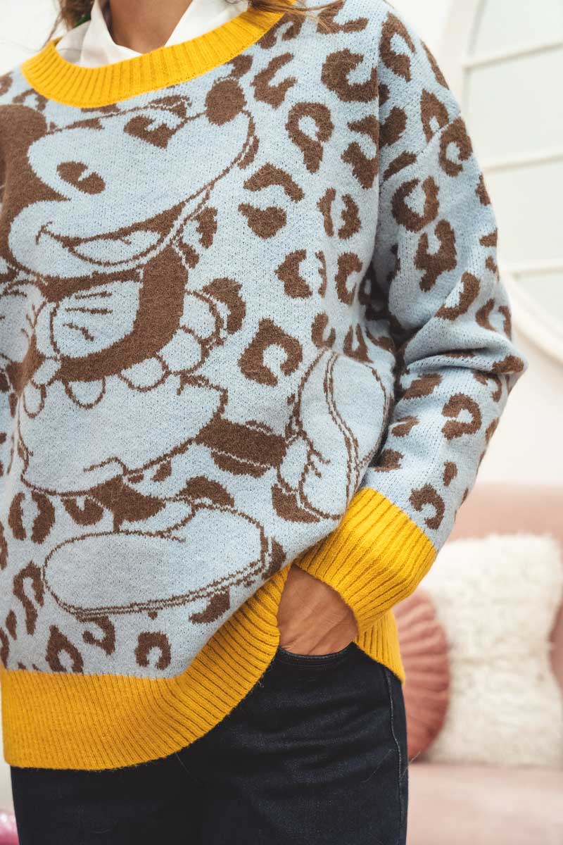 Maglia color block azzurro e marrone con stampa Mickey Mouse e profili senape. Divertente, comoda e super trendy.