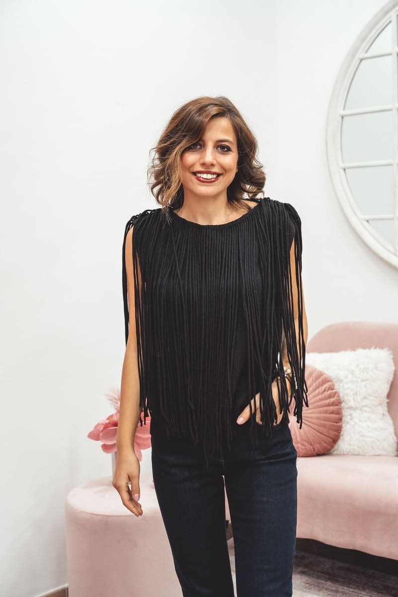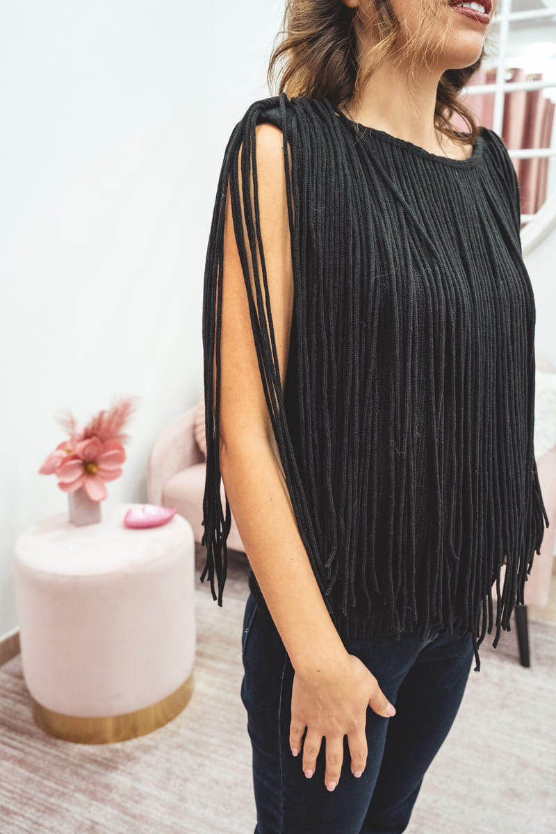 Maglia nera smanicata con frange decorative: un capo grintoso e versatile, perfetto per dare movimento e stile al tuo look.