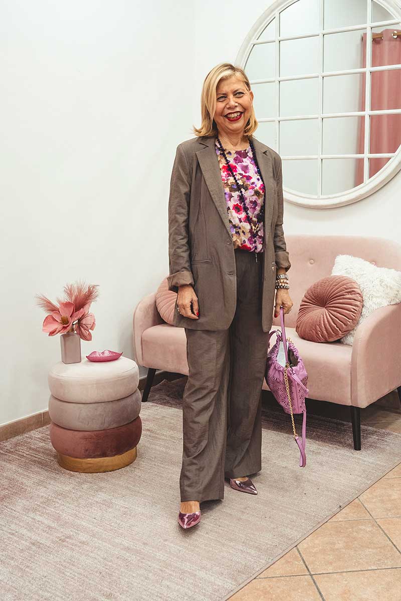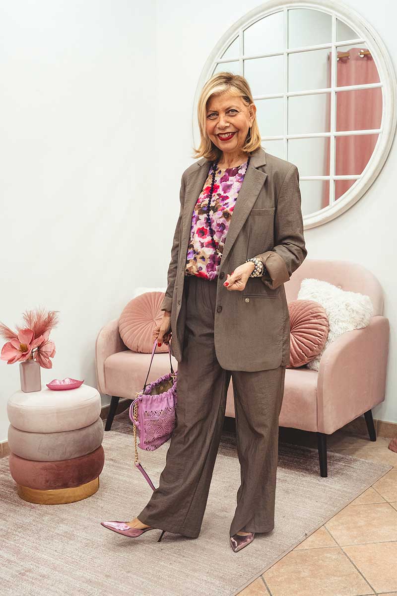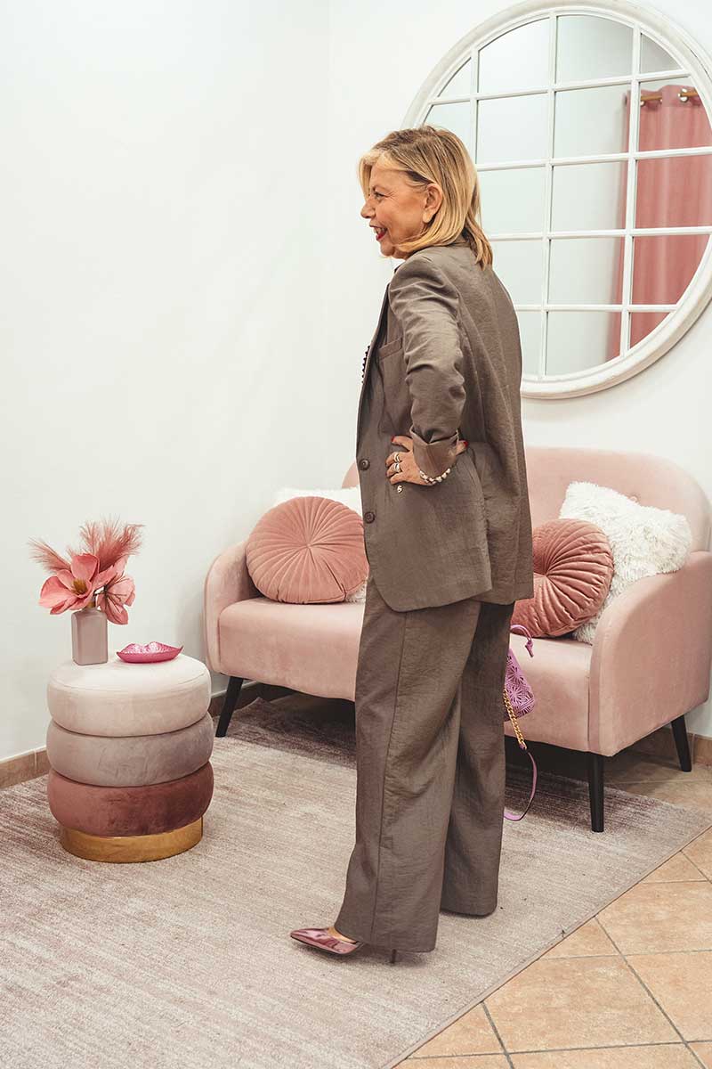 Il tailleur color liquirizia è l’emblema dell’eleganza moderna.
