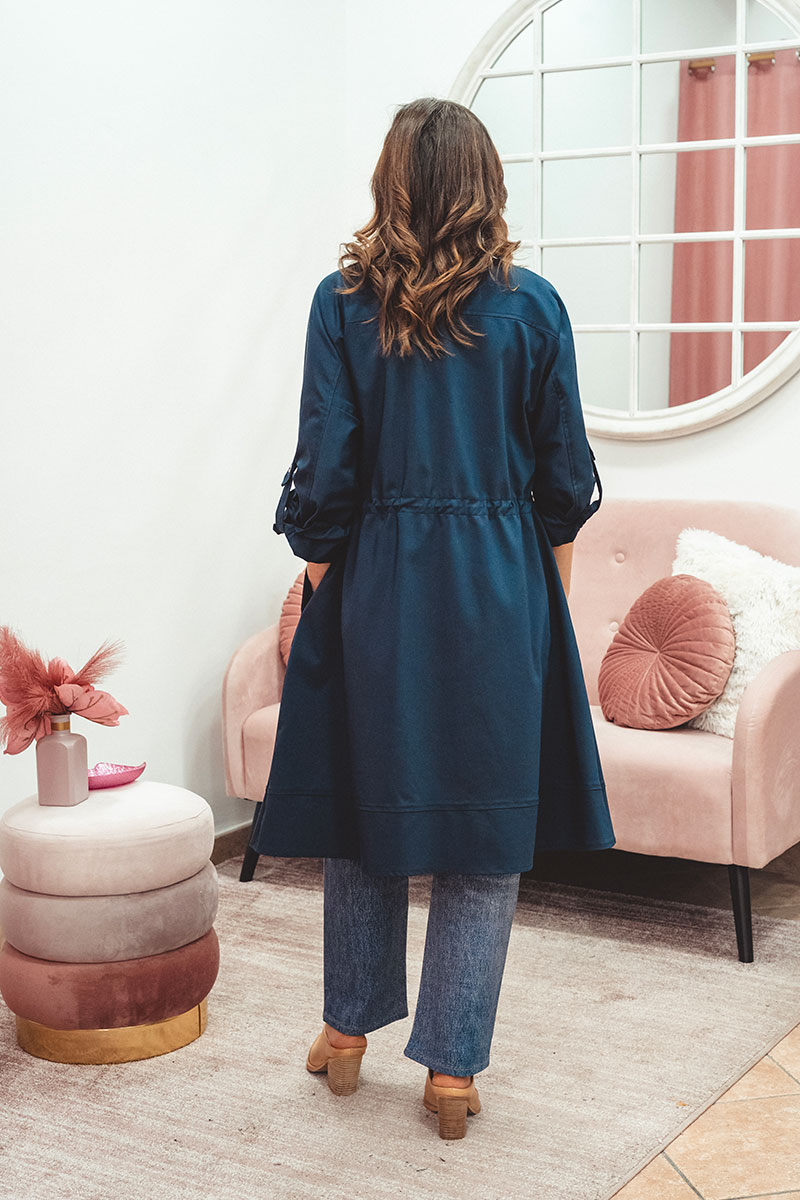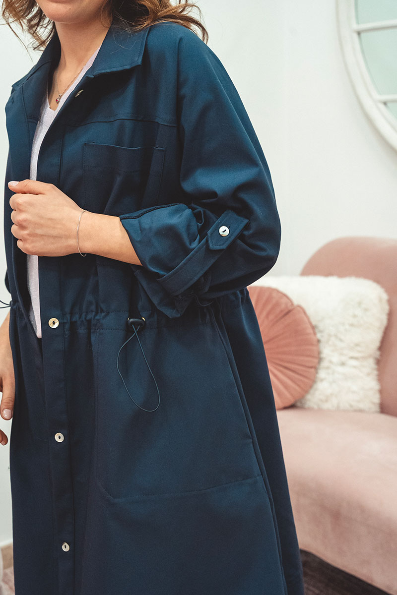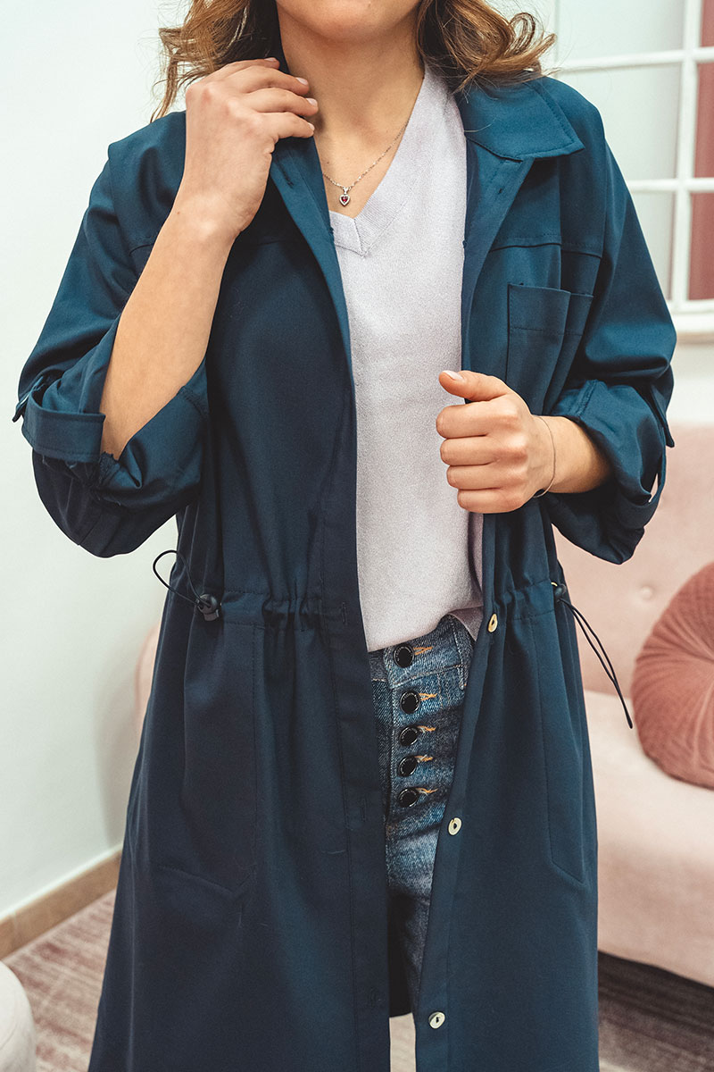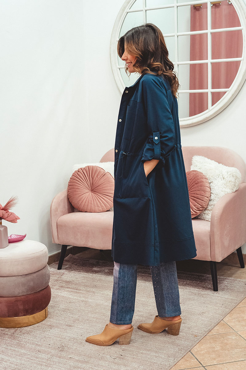 Il trench blu abbottonato è il capospalla ideale per affrontare la mezza stagione con stile e funzionalità.
